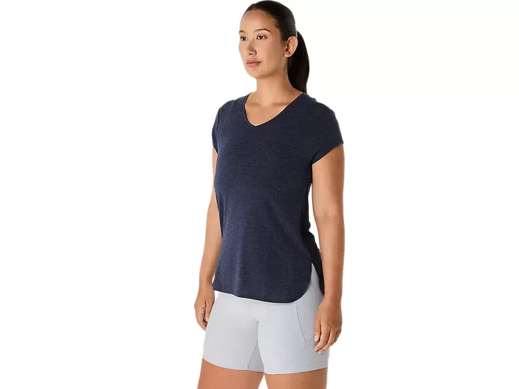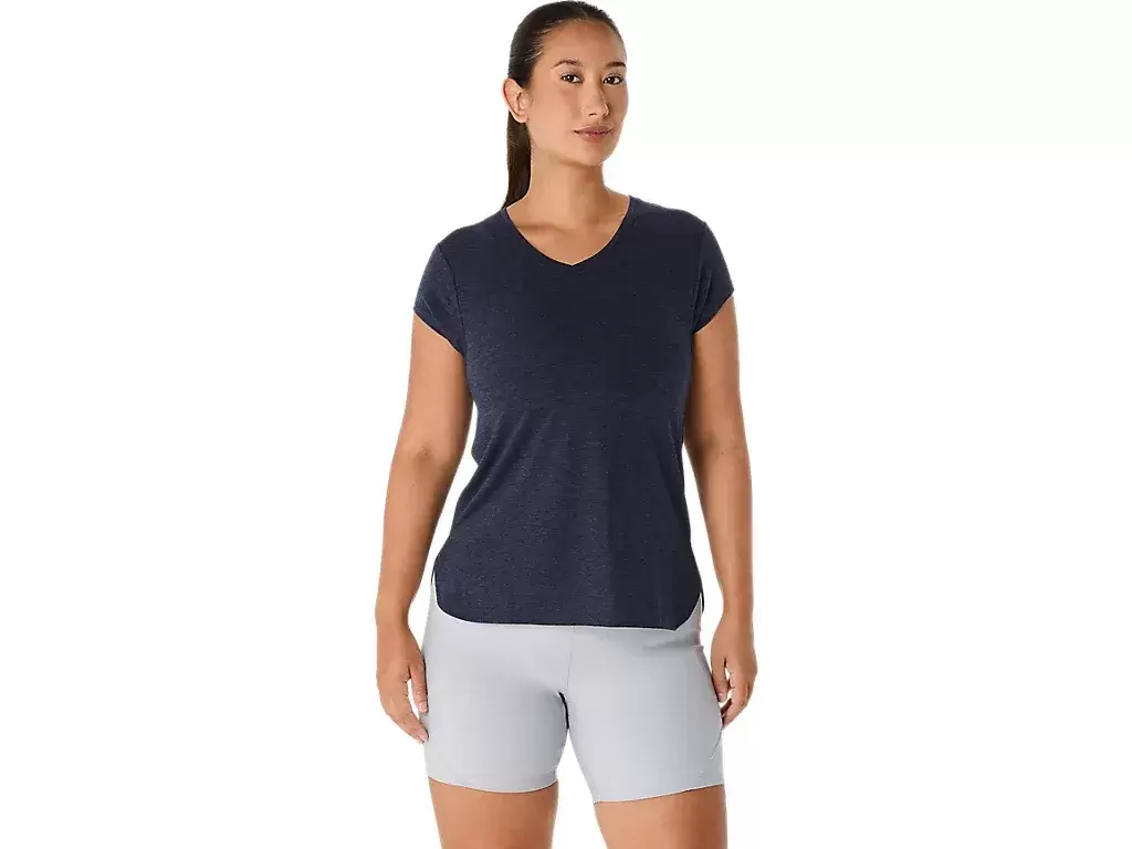 Tento top s krátkým rukávem a výstřihem do V je navržen tak, aby poskytoval elegantní pocit přiléhavosti k tělu. Je vyroben z pohodlného úpletu, který je doplněn předními bočními švy pro lepší volnost pohybu.