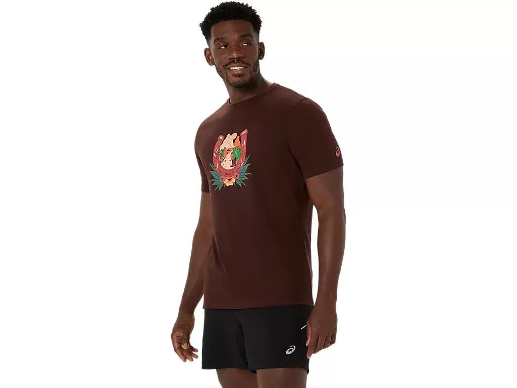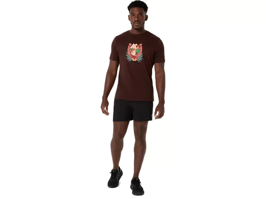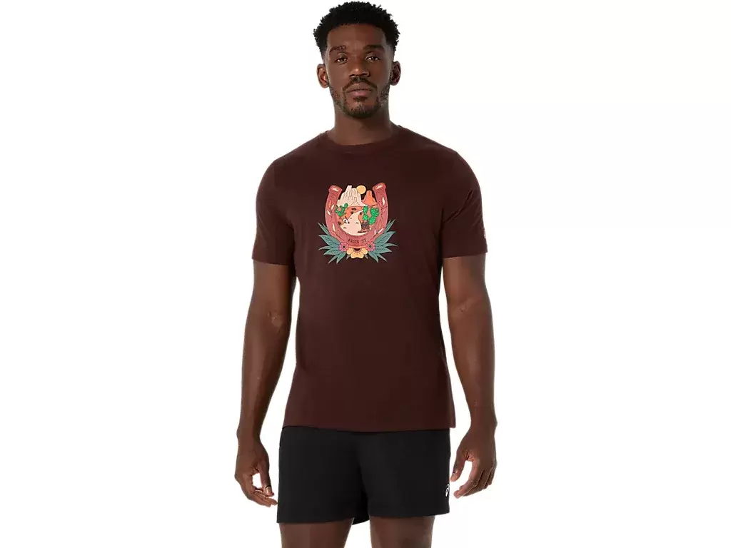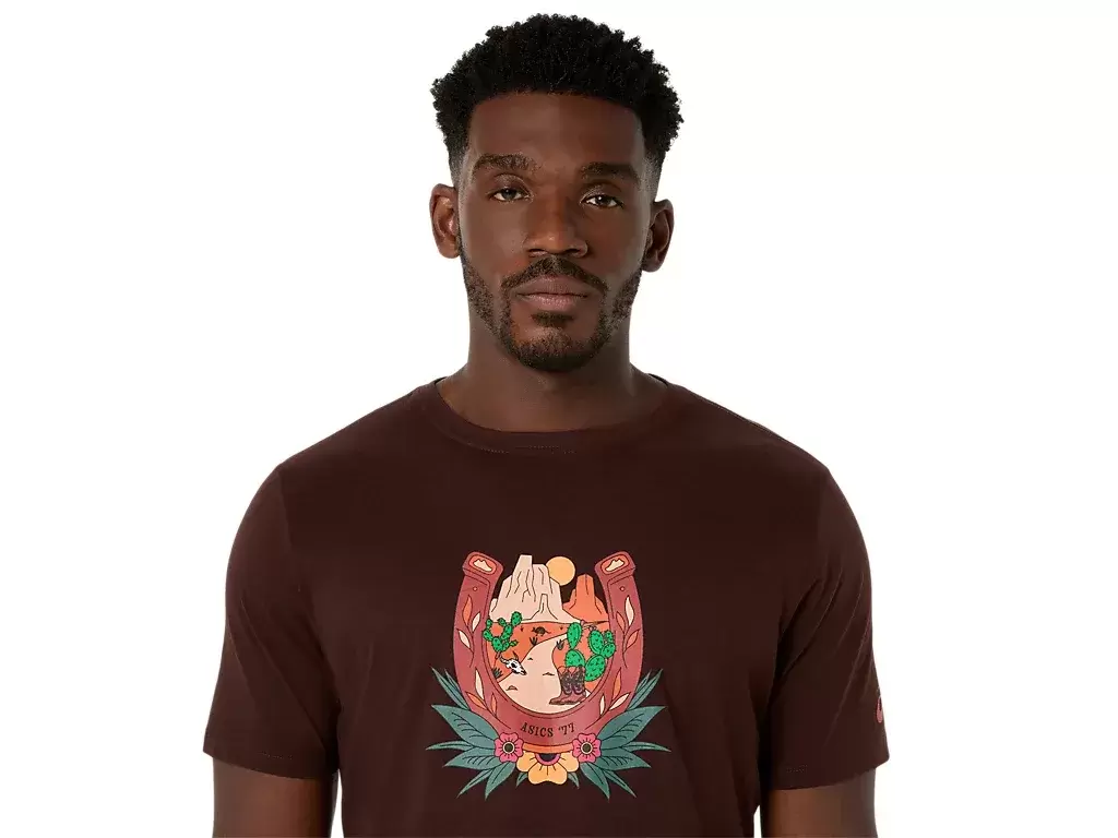 Toto pohodlné pletené tričko s krátkým rukávem je inspirováno pouštní krajinou. Na hrudi je zdobeno grafikou podkovy a horského výhledu při západu slunce.