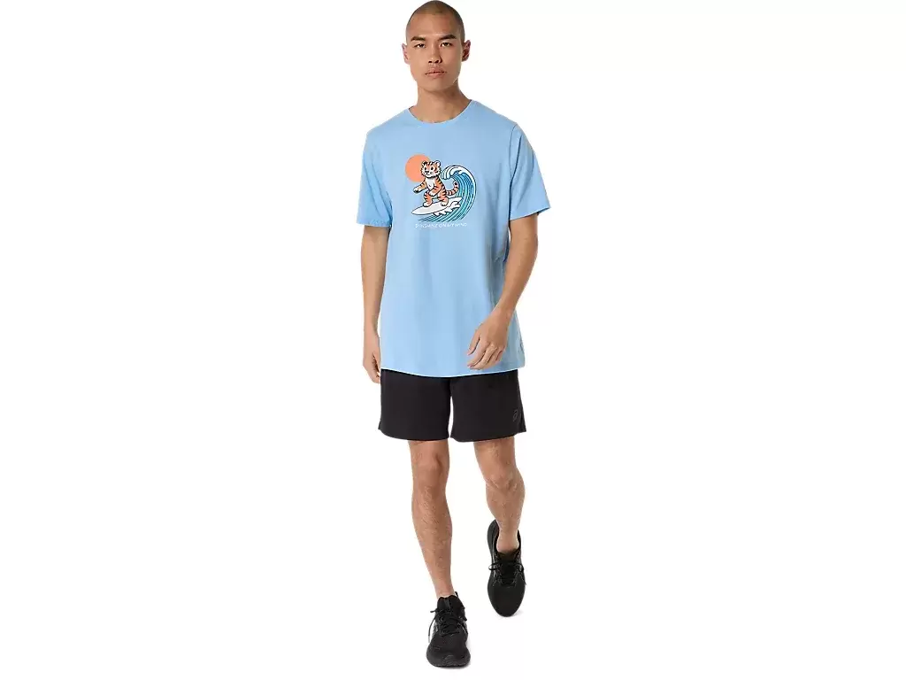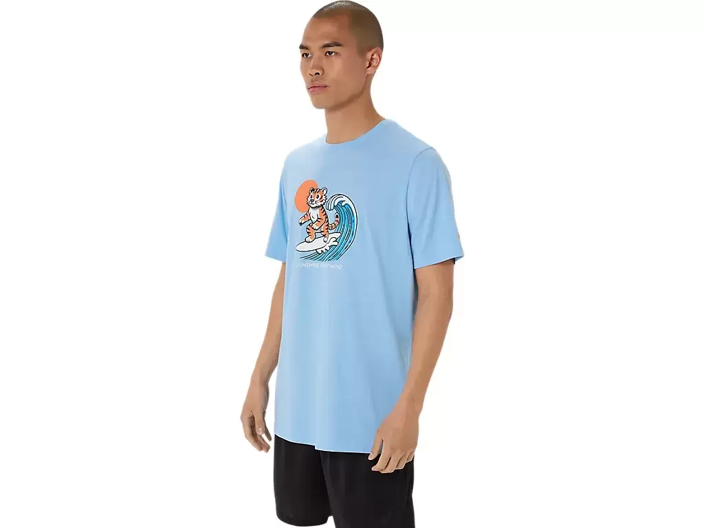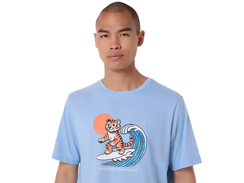 Toto pohodlné pletené tričko s krátkým rukávem je inspirováno pláží. Přední grafika zobrazuje tygra surfujícího a pod ní je nápis „SUNSHINE ON MY MIND“.